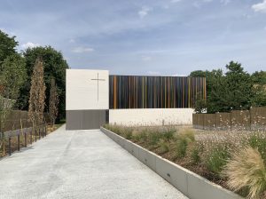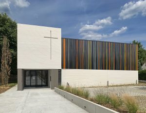 BESCHREIBUNG: Neues Kirchengebäude in Montigny–Lès–Cormeilles bei Paris, Frankreich. Glaskunstfront, 6 m x 18,5 m, ohne Metallrahmen.