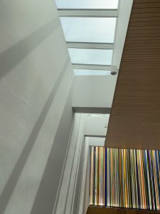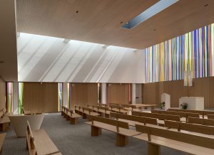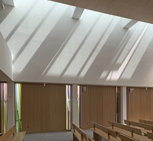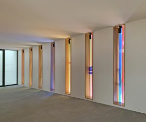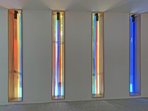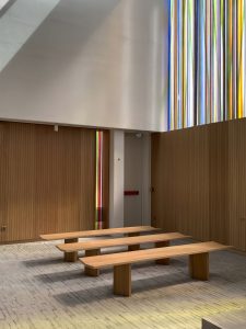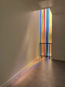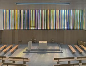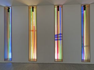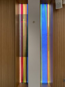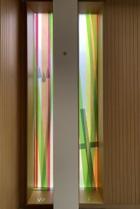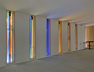 Die Komposition ist im Prinzip einfach, wird aber im Kontext komplex. Sechs Farben (grün, orange, gelb, blau, rot und grau) werden nebeneinander aufgetragen, manchmal überlappen sie sich auf beiden Seiten der Glasmalerei. Dank der Besonderheit der Linit-Gläser ist der Raum zwischen den beiden Glaswänden beträchtlich. Dieser Raum trägt zur Komposition bei, indem er eine große Tiefe der Interaktion zwischen den beiden Flächen schafft. Der Betrachter entdeckt somit eine sich je nach seiner Position in der Kirche verändernde Komposition. LICHT-RAUM.